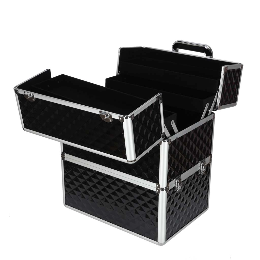 Ta velik kozmetični kovček v slogu frizerskega “train case” ponuja pametno razporeditev prostora: po odprtju pokrova se izvlečejo štirje pregledni predali, v spodnjem delu pa je globok prostor za večje izdelke, stekleničke in pripomočke. Vzdržljiva izvedba z aluminijastimi robovi in ojačanimi vogali ščiti vsebino med potovanjem in pri vsakodnevni rabi.
