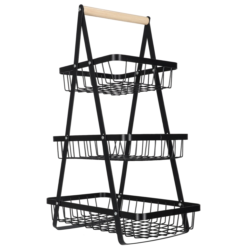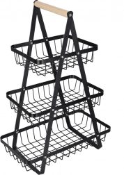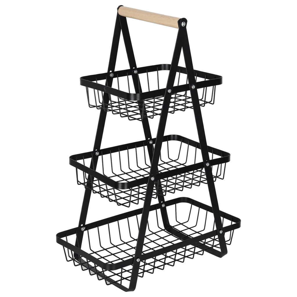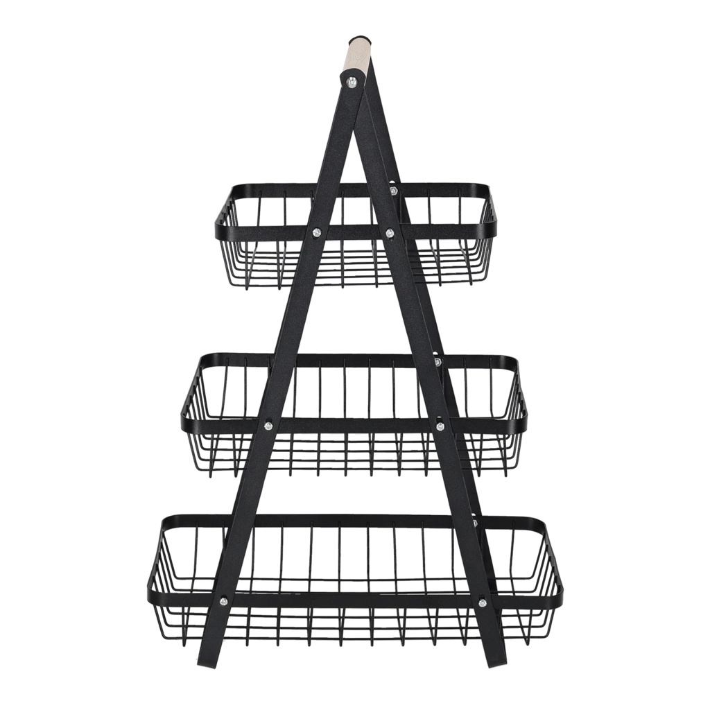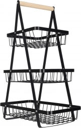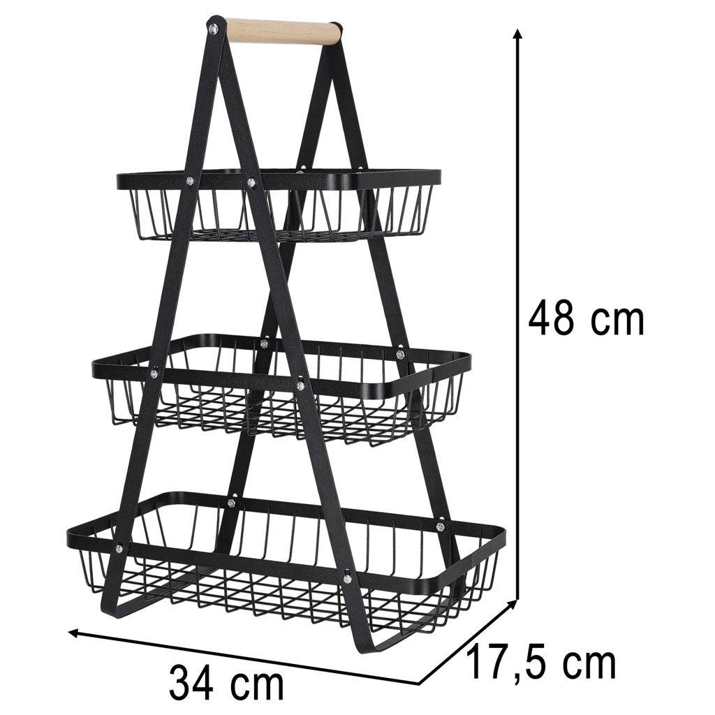 Uredite kuhinjo, shrambo ali jedilnico z elegantnim tristopenjskim stojalom. Robustna kovinska konstrukcija v mat črni barvi in udoben lesen ročaj zagotavljata stabilnost, vzdržljivost in enostavno prenašanje. Zaradi stopničaste razporeditve imate vsebino vedno na očeh in pri roki.