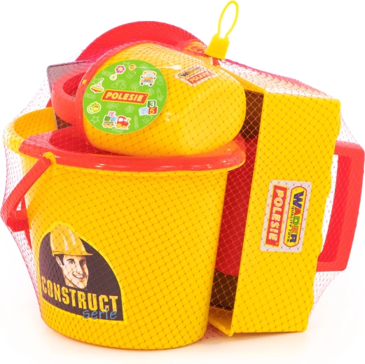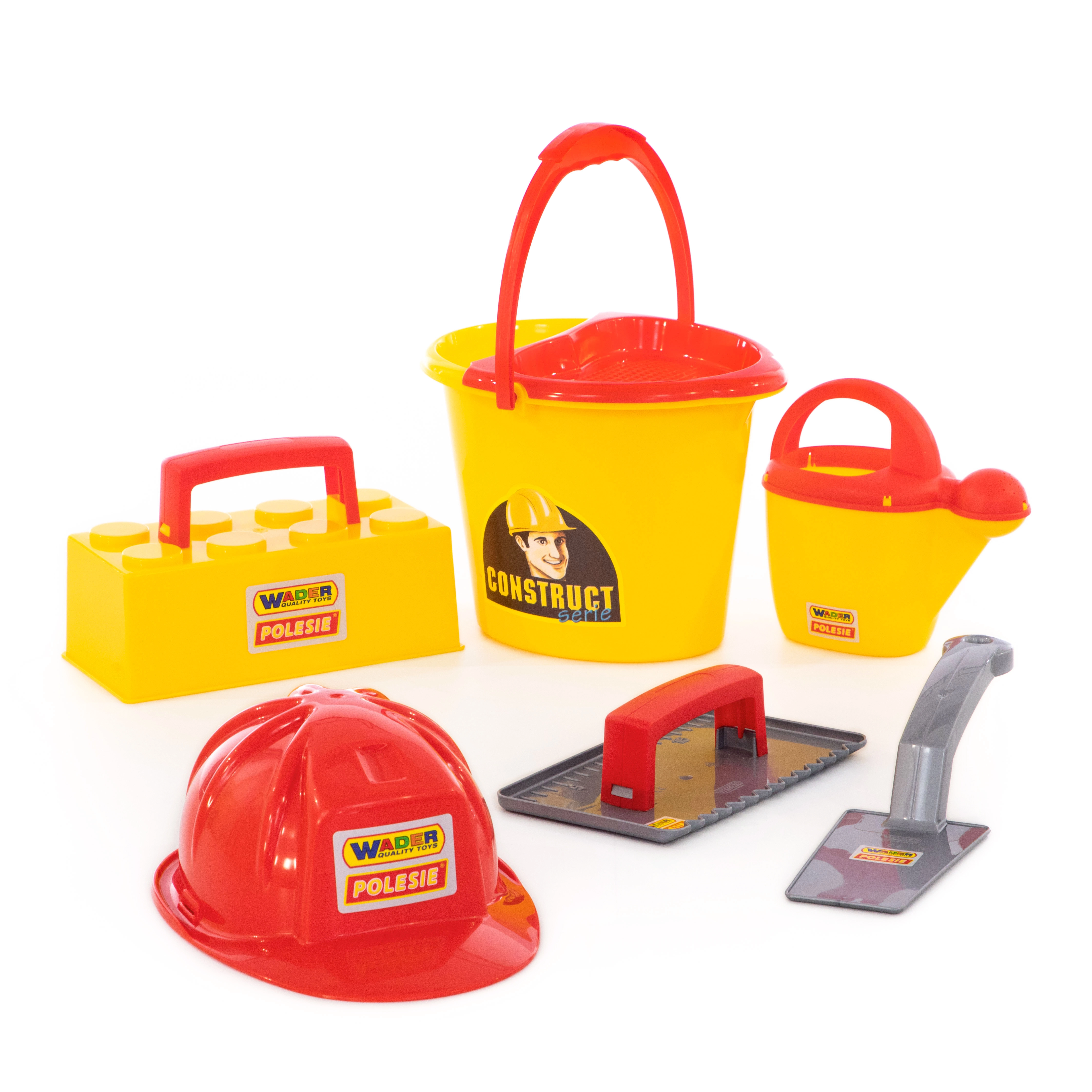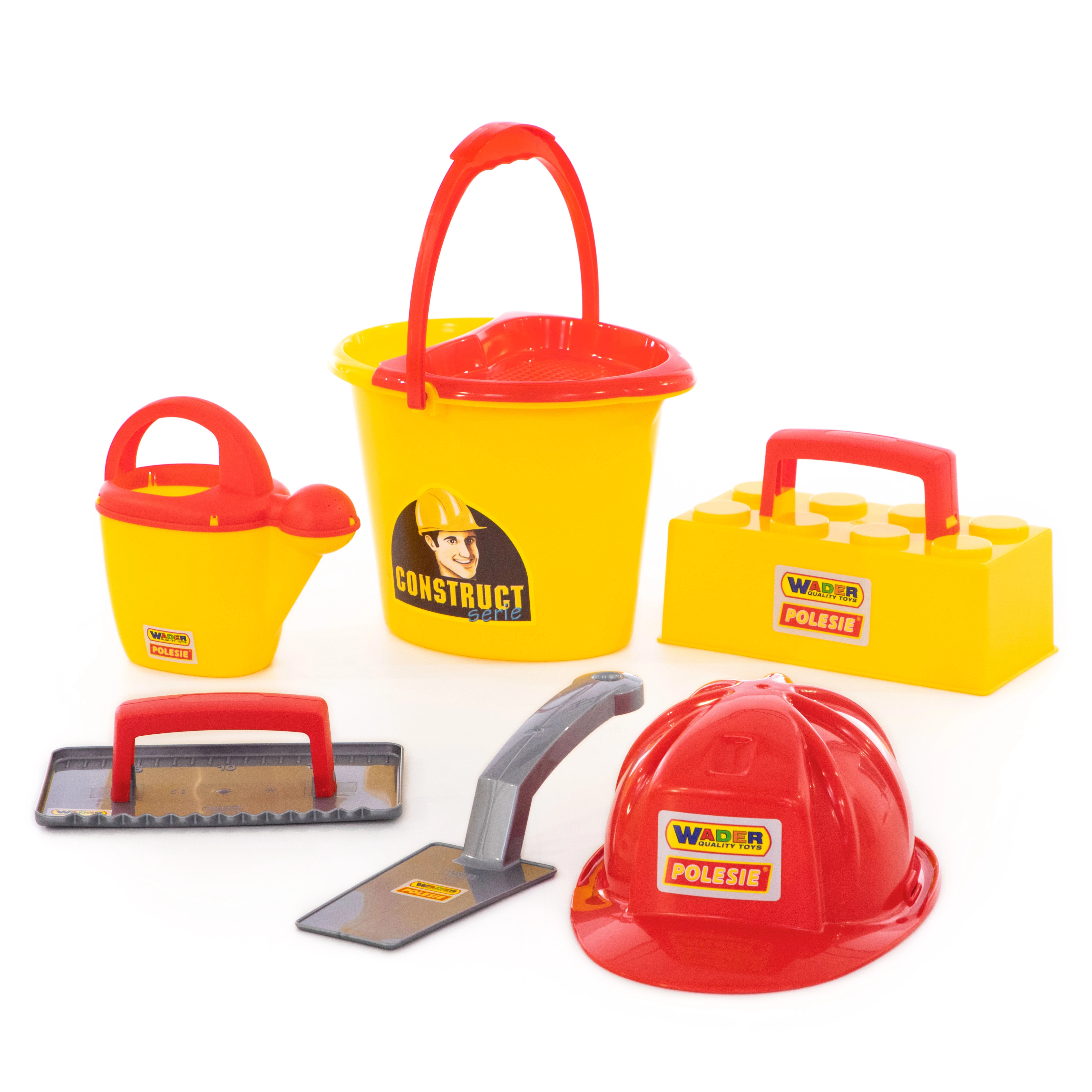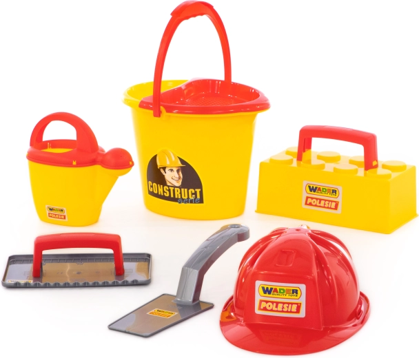 Vse potrebno v enem: vedro, zalivalka, zidarska žlica, gladilka, model za opeke in čelada – pripravljeno za peskovnik in plažo.
