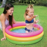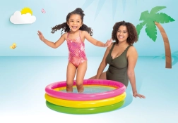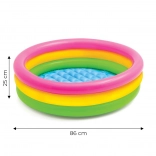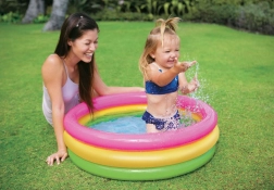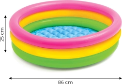 Napihljiv bazen INTEX prinaša otrokom veselje vodnih iger kar na vaš vrt. Zaradi kompaktnih dimenzij 86 × 25 cm se prilega skoraj kamor koli, nizka vodna gladina 17 cm pa povečuje občutek varnosti za najmlajše. Mavrična barvna izvedba je privlačna in vabi k igri.