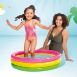 Lahek in varen otroški bazen z mavričnim dizajnom za osvežitev na vrtu. Ima močne napihljive stene, tri komore, mehko napihljivo dno in je izdelan iz odpornega PVC. Idealen za poletno igro in hitro hlajenje.