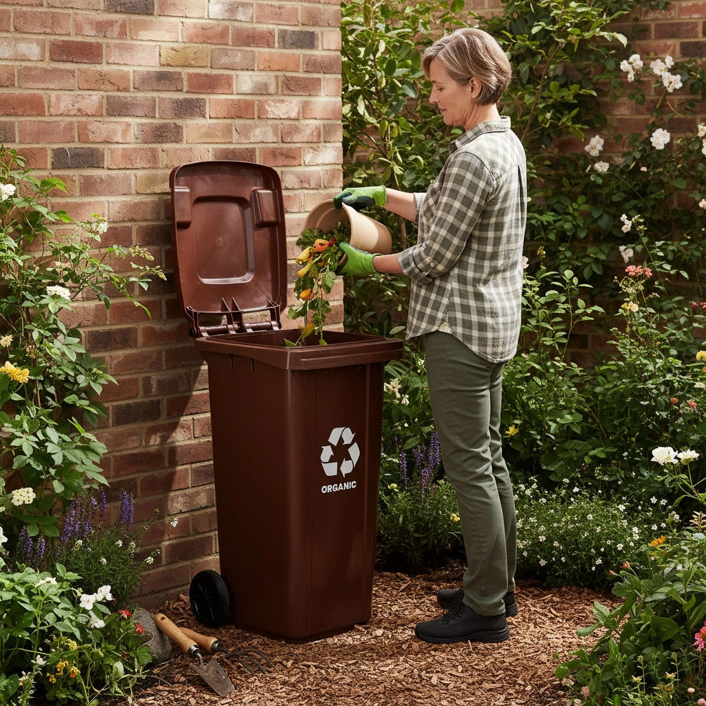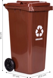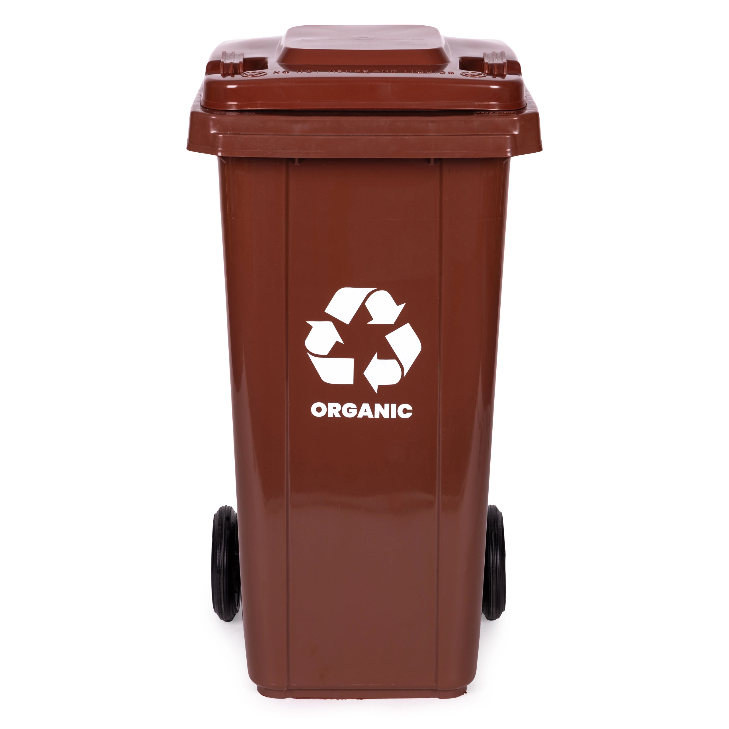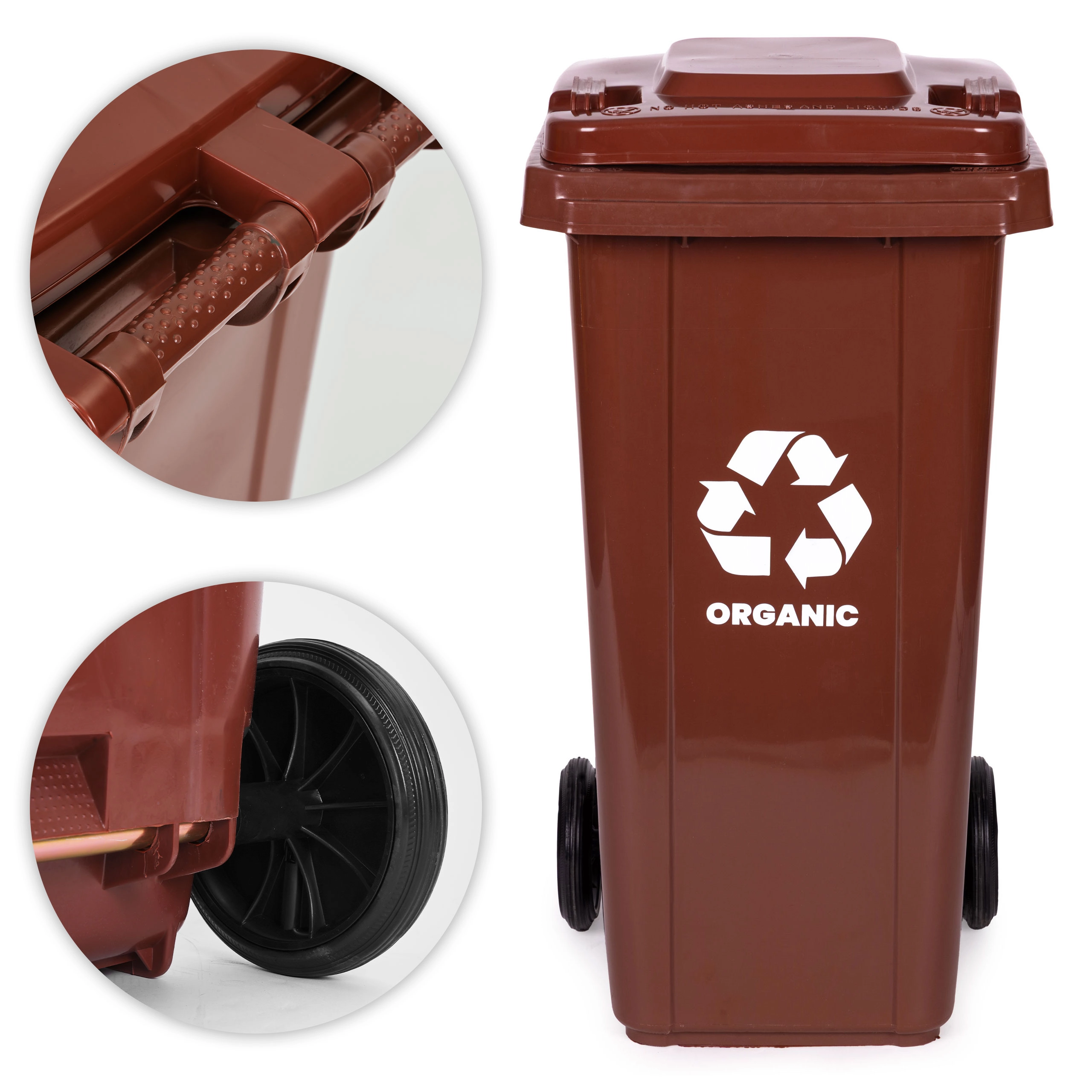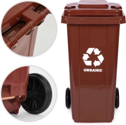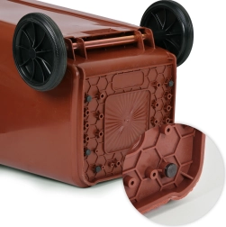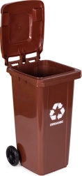 Praktčen rjav koš za bioodpadke s prostornino 120 l iz odpornega HDPE s certifikatom EN-840. Ponuja gumijasta kolesa in ergonomske ročaje za enostavno premikanje, zaklepajoč pokrov proti dežju in vonjavam ter stabilizacijske nogice za varnost na spolzki podlagi. Idealno za gospodinjstva in podjetja, odporno proti UV sevanju, kemikalijam in mehanskim poškodbam.