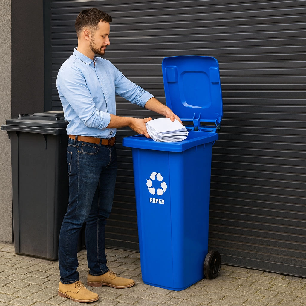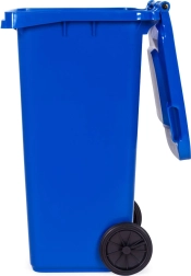 Vzdržljiv moder zabojnik za ločeno zbiranje z zmogljivostjo 120 l za papir. Izdelan iz UV-odpornega HDPE, z zaprtim pokrovom, gumijastimi kolesi na kovinski osi in ergonomskimi ročaji za enostavno ravnanje. Izpolnjuje EN 840 ter certifikate ISO9001/14001/45001 – idealno za gospodinjstva in podjetja.