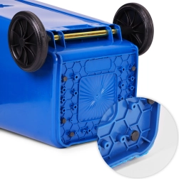 Robusten 120-litrski zabojnik za papir iz visokokakovostnega HDPE je odporen na UV-sevanje, kemikalije in mehanske poškodbe. Tesen pokrov preprečuje vdor dežja in uhajanje vonjav, zato je primeren za zunanjo in notranjo uporabo. Gumijasta kolesa na kovinski osi in protidrsni ročaji zagotavljajo udobno premikanje tudi pri polni obremenitvi.