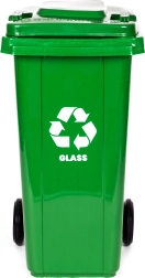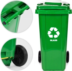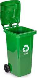 Praktičen in trpežen zabojnik za ločevanje stekla s prostornino 120 l iz HDPE, odpornega na UV, kemikalije in mehanske poškodbe. Gumijasta kolesa in ergonomski ročaj zagotavljajo enostavno rokovanje, tesnilni pokrov pa ščiti pred dežjem in neprijetnimi vonjavami. Stabilnost na spolzki podlagi povečujejo proti-zdrsne nogice. Primerno za gospodinjstva in podjetja, združljivo s komunalnim odvozom po EN 840 in certificirano po ISO9001, ISO14001, ISO45001.