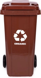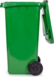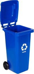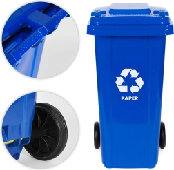 Barve in napisi za papir, steklo, plast/kovino, mešane in bio odpadke poenostavijo pravilno ločevanje doma in v podjetju. Vsak koš ima 120 l in zaklepni pokrov.