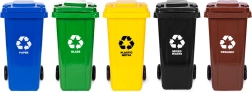 - Modra (papir), zelena (steklo), rumena (plast/kovina), črna (mešani), rjava (bio)
