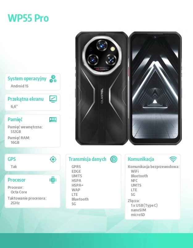 Iščete telefon, ki prenese zahtevno delo in pustolovščine na terenu? OUKITEL WP55 Pro združuje vrhunsko odpornost z modernimi zmogljivostmi in opremo. Certifikati IP68, IP69K in MIL‑STD‑810H ščitijo pred prahom, vodo in padci z višine do 1,5 m, medtem ko robustna zasnova z nedrsečo teksturo zagotavlja zanesljiv oprijem.