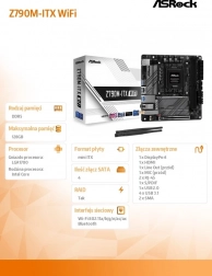 ASROCK Z790M‑ITX WiFi je odlična izbira za zmogljive, a prostorsko varčne računalnike. Ponuja 7+1+1‑fazno napajanje z Dr.MOS za stabilno delovanje procesorjev Intel Core do 14. generacije, dva DDR5 reža s podporo visokim frekvencam in polnovredno režo PCIe 5.0 x16 za najnovejše grafične kartice.