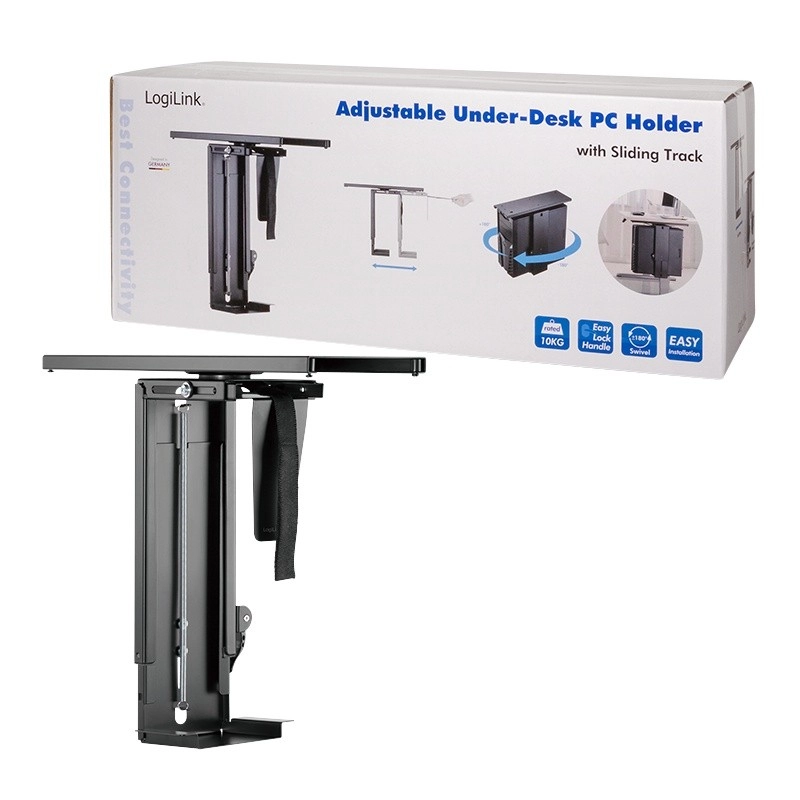 Vrtljiv in izvlečni mehanizem olajša dostop do priključkov in vzdrževanja, medtem ko hitro zapiralna ročica omogoča hitro nastavitev in zaklep pravilnega položaja. Namestitev PC-ja pod mizo hkrati zmanjšuje nabiranje prahu in izboljšuje kroženje zraka v delovnem prostoru.
