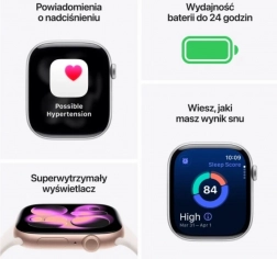 Eleganten dizajn, več zdravja, več zmogljivosti. Apple Watch Series 11 v aluminijasti izvedbi v barvi rožnatega zlata so lahke, tanke in udobne za celodnevno nošenje – tudi med spanjem. Tako dobite neprekinjen pregled nad svojim zdravjem in aktivnostmi. Zaslon Ion‑X je dvojno bolj odporen proti praskam v primerjavi s prejšnjo generacijo, baterija pa zdrži do 24 ur običajne uporabe, pri čemer v 15 minutah napolni za do 8 ur.