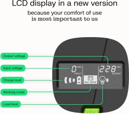 Ta UPS je idealna izbira za dom in pisarno, kjer sta ključni stabilnost napajanja in zaščita občutljive elektronike. Zahvaljujoč izhodu s čisto sinusno napetostjo brez težav napaja naprave z aktivnim PFC, strežnike, NAS, omrežne elemente, avdio/video opremo in delovne postaje. LCD-zaslon pregledno prikazuje stanje baterije, obremenitev, vhodno/izhodno napetost in druge pomembne parametre.