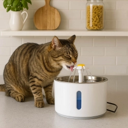 Filtrirna kartuša z aktivnim ogljem sproti odstranjuje prah, dlake in drobne nečistoče. Enostavno USB napajanje (DC 5 V / 1 A) in nizka poraba 1,5 W omogočata tih 24/7 način delovanja. Prostornina 2,4 l je idealna za mačke ter majhne in srednje velike pse.