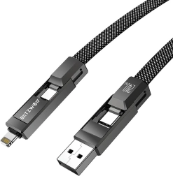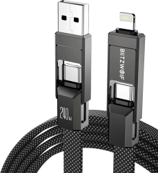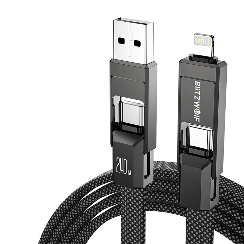 Univerzalni kabel 4 v 1 znamke BlitzWolf združuje priključke USB‑A, USB‑C in Lightning za hitro polnjenje in prenos podatkov. Podpira moč do 240 W (USB‑C ↔ USB‑C), hitro polnjenje PD za iPhone do 27 W ter prenos podatkov do 480 Mb/s. Trpežna najlonska pletenica in dolžina 1,2 m zagotavljata dolgo življenjsko dobo in udobno uporabo doma, v pisarni in na poti.