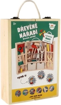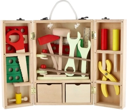 Odkrijte kakovosten leseni kovček z orodjem, ki otrokom omogoča varno posnemanje sveta odraslih. V kompletu najdejo izvijače, kladivce, ključe, matice, vijake, kotnik, ravnilo, žago in druge dodatke. Vse je pregledno shranjeno v čvrstem kovčku z ročajem za enostavno prenašanje.