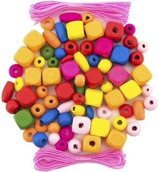 Ta komplet vsebuje različne vrste in oblike biserov v veselih barvah. Otroci lahko bisere nizajo na elastike in ustvarjajo edinstvene zapestnice in verižice, ki so raztegljive.