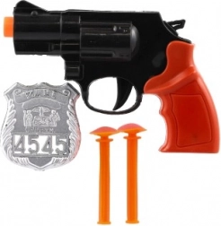 Ta policijski komplet prinaša otrokom veliko zabave pri varnem igranju poklica. Plastična pištola z oranžno konico izstreljuje mehke puščice s priseskom, ki se pritrdijo na gladke površine. Dopolnjuje jo podrobna značka, zaradi katere bo vsaka misija še bolj realistično doživetje.