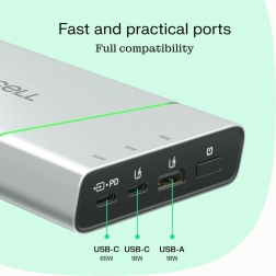 - Moč 65 W (USB‑C PD) – hitro polnjenje prenosnikov in telefonov.