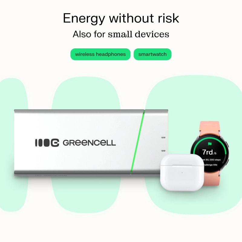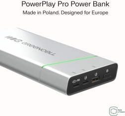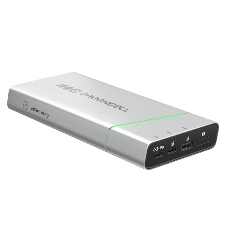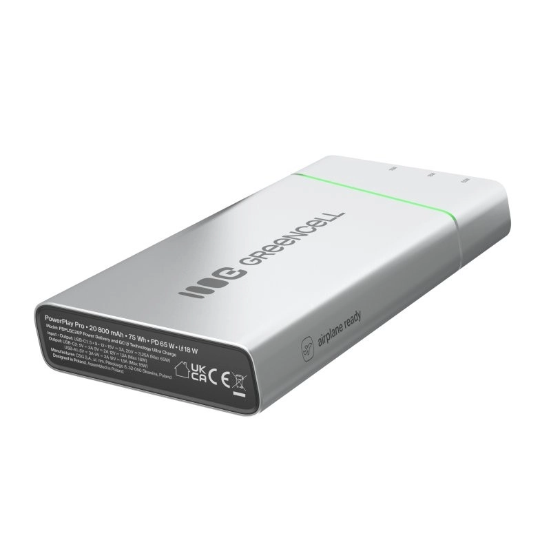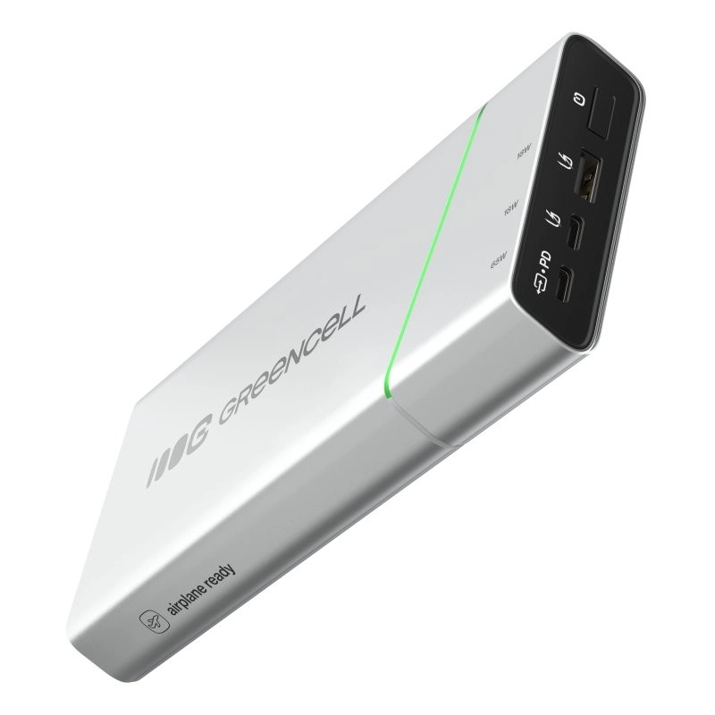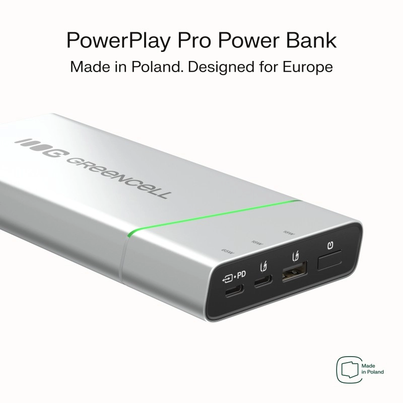 Kompaktna in zmogljiva power banka GREENCELL PowerPlay Pro ponuja kapaciteto 20.800 mAh in hitro polnjenje USB‑C Power Delivery 65 W. Zahvaljujoč 2× USB‑C in 1× USB‑A s tehnologijo Ultra Charge bliskovito napolni prenosnik, telefon in slušalke. Odporna zasnova, do 1000 polnilnih ciklov ter celovita zaščita pred prenapetostjo, kratkim stikom in prenapolnjenostjo. Primerna za potovanja in dovoljena na letalu.
