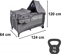 Ta večnamenska potovalna posteljica raste z vašim otrokom od rojstva do približno 36 mesecev. Robustno ogrodje v obliki X in dve višinski ravni ležišča zagotavljata varnost in udobje, medtem ko mrežasti paneli omogočajo odlično kroženje zraka in dober pregled nad dojenčkom. Strešica s komarnikom ščiti pred insekti, viseče plišaste igračke pa zabavajo malčka.