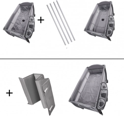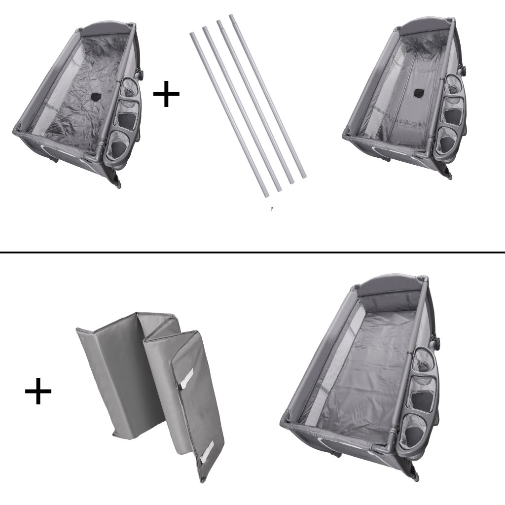Za starše sta tu previjalni nastavek in praktični organizatorji za plenice in drobnarije, zato je vse vedno pri roki. Hiter zložljiv mehanizem, kolesa z aretacijo in transportna torba olajšajo prenašanje in shranjevanje – idealno za počitnice, k starim staršem in za majhna stanovanja.