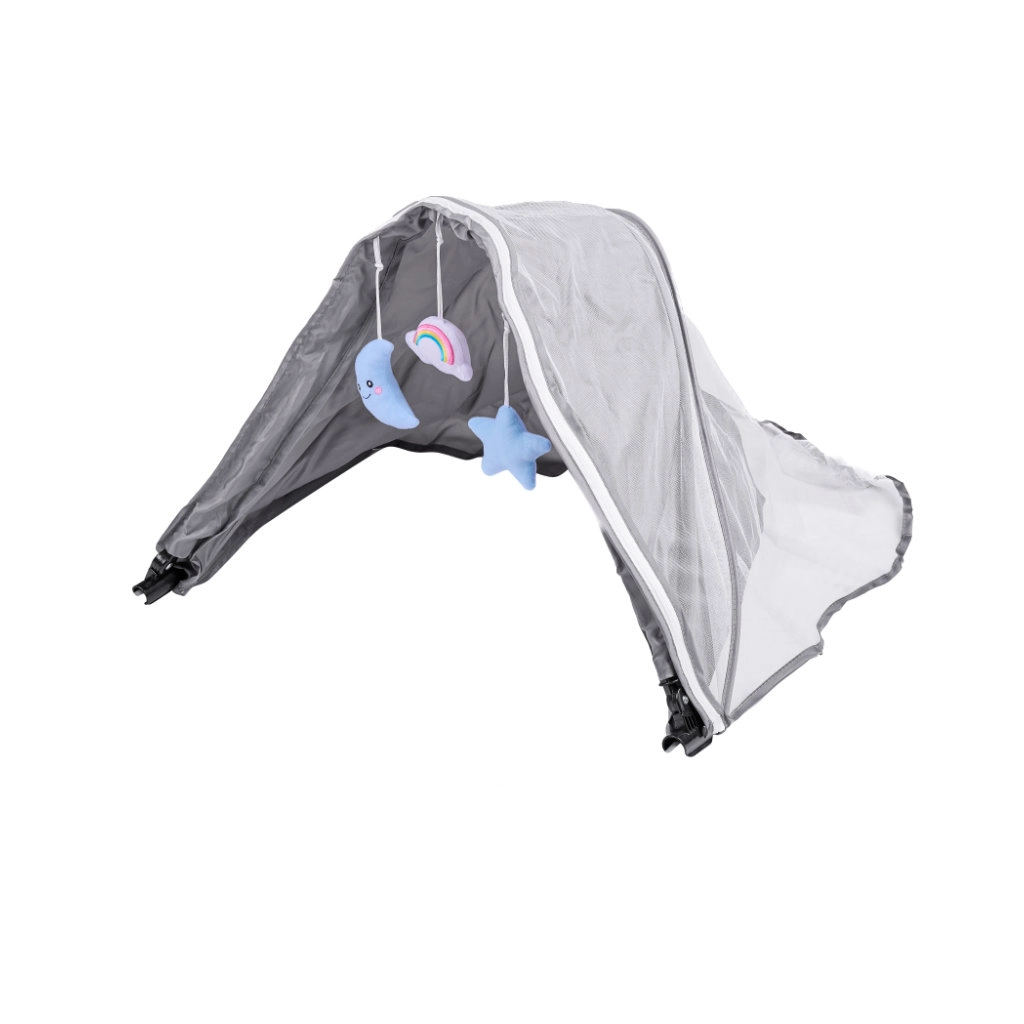 Lahka mrežica ščiti pred insekti in hkrati omogoča zračenje. Viseče plišaste igračke (luna, mavrica, zvezda) spodbujajo razvoj čutov in zabavajo dojenčka.