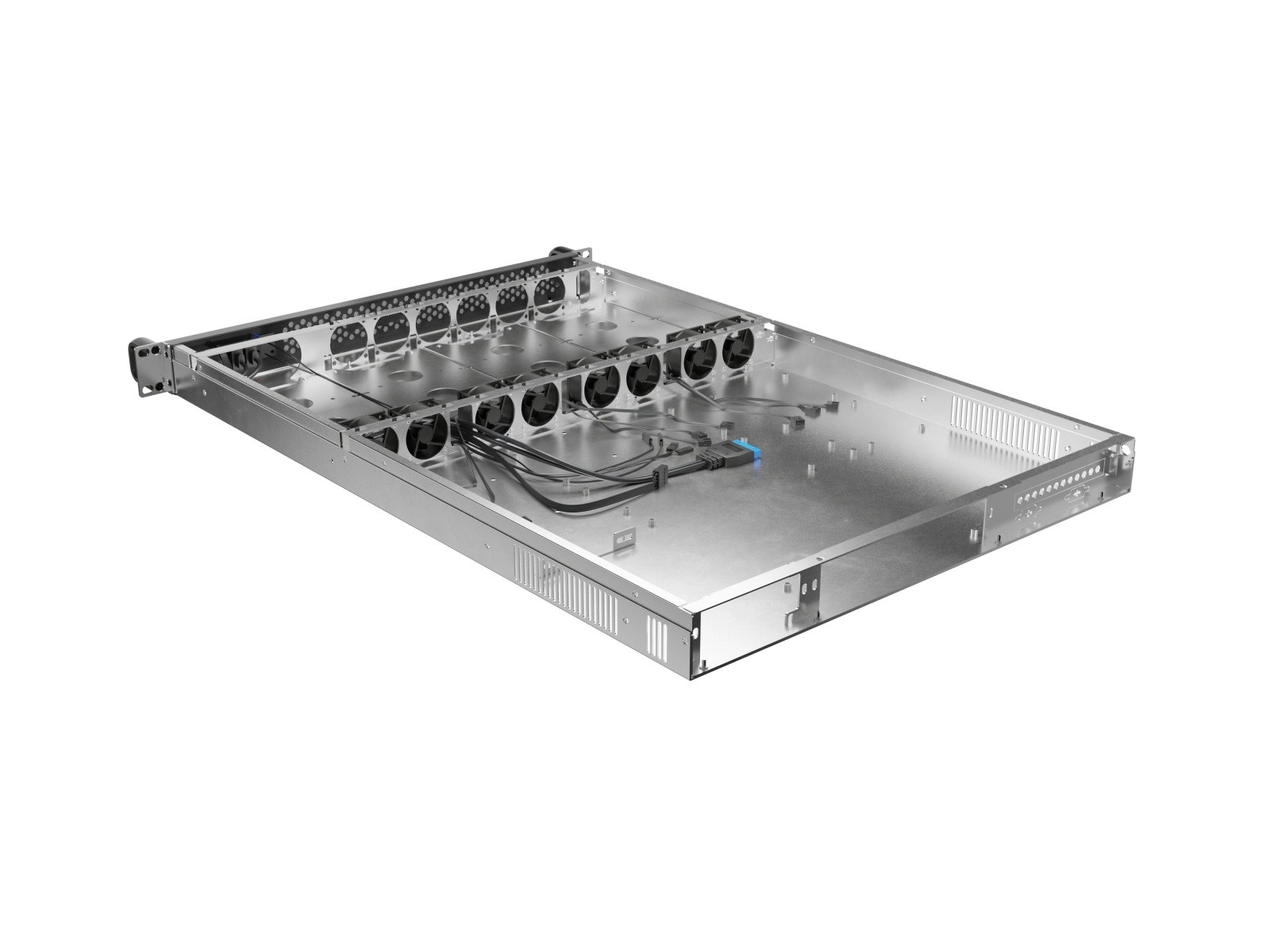 Ta 1U rack omara je zasnovana za gradnjo zmogljivih strežnikov v minimalni višini. Podpira širok nabor formatov plošč, vključno z E‑ATX in SSI EEB, obvlada več PCI razširitev in zahvaljujoč premišljenemu pretoku zraka ohranja stabilne temperature tudi pri dolgotrajni obremenitvi. Robustno, galvansko pocinkano jeklo debeline 1,2 mm zagotavlja dolgo življenjsko dobo in zaščito komponent.