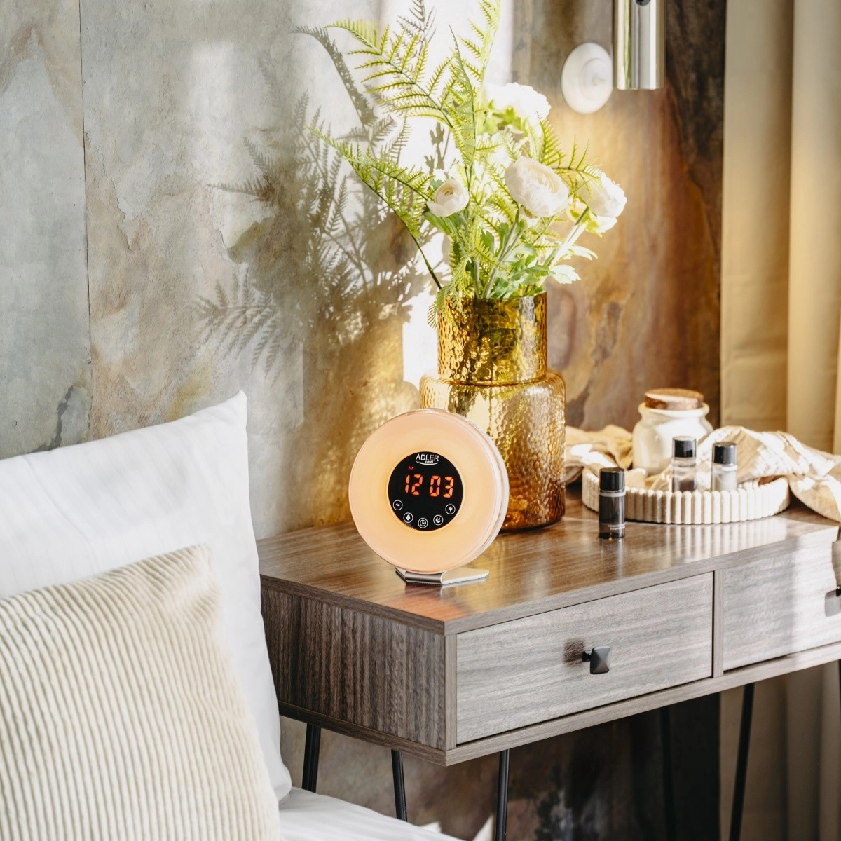Budilka postopoma povečuje svetlobo, da vas prebudi nežno in brez stresa. Podpira pravilen spalni ritem in prijetnejša jutra.