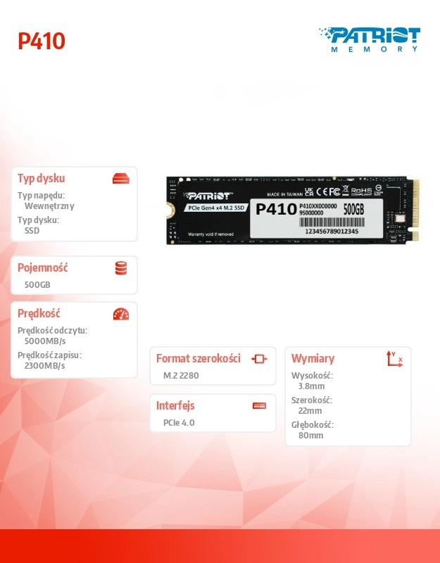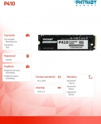Patriot P410 je sodoben PCIe 4.0 NVMe SSD v formatu M.2 2280, zasnovan za odziven sistem in krajše nalaganje iger ter programov. Z izboljšanim upravljanjem temperature in grafenskim toplotnim slojem ohranja stabilno delovanje tudi pri dolgotrajni obremenitvi.