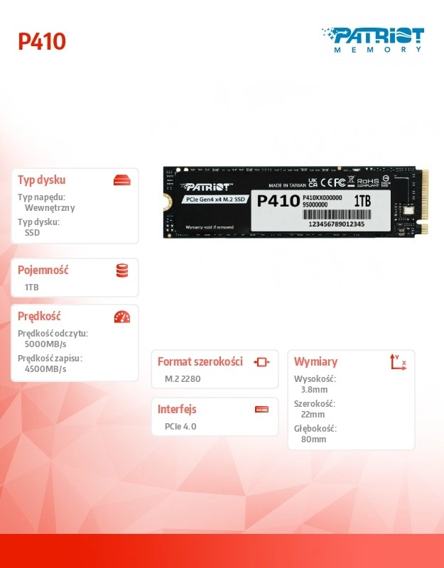 Patriot P410 prinaša sodoben vmesnik PCIe Gen4 x4 in protokol NVMe 1.4 za bliskovit odziv sistema, krajše nalaganje iger in hitre prenose podatkov. Tanka zasnova M.2 2280 zagotavlja brezhibno združljivost z večino namiznih računalnikov in prenosnikov.