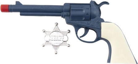 Postanite mali kavboj! Ta plastični revolver s šerifsko značko bo razveselil vse male pištolarje. Igrača oddaja klapajoči zvok, priloženi sta tudi šerifska značka in plakat »Iskan« za še več zabave. Idealna igrača za otroke od 3 let.
