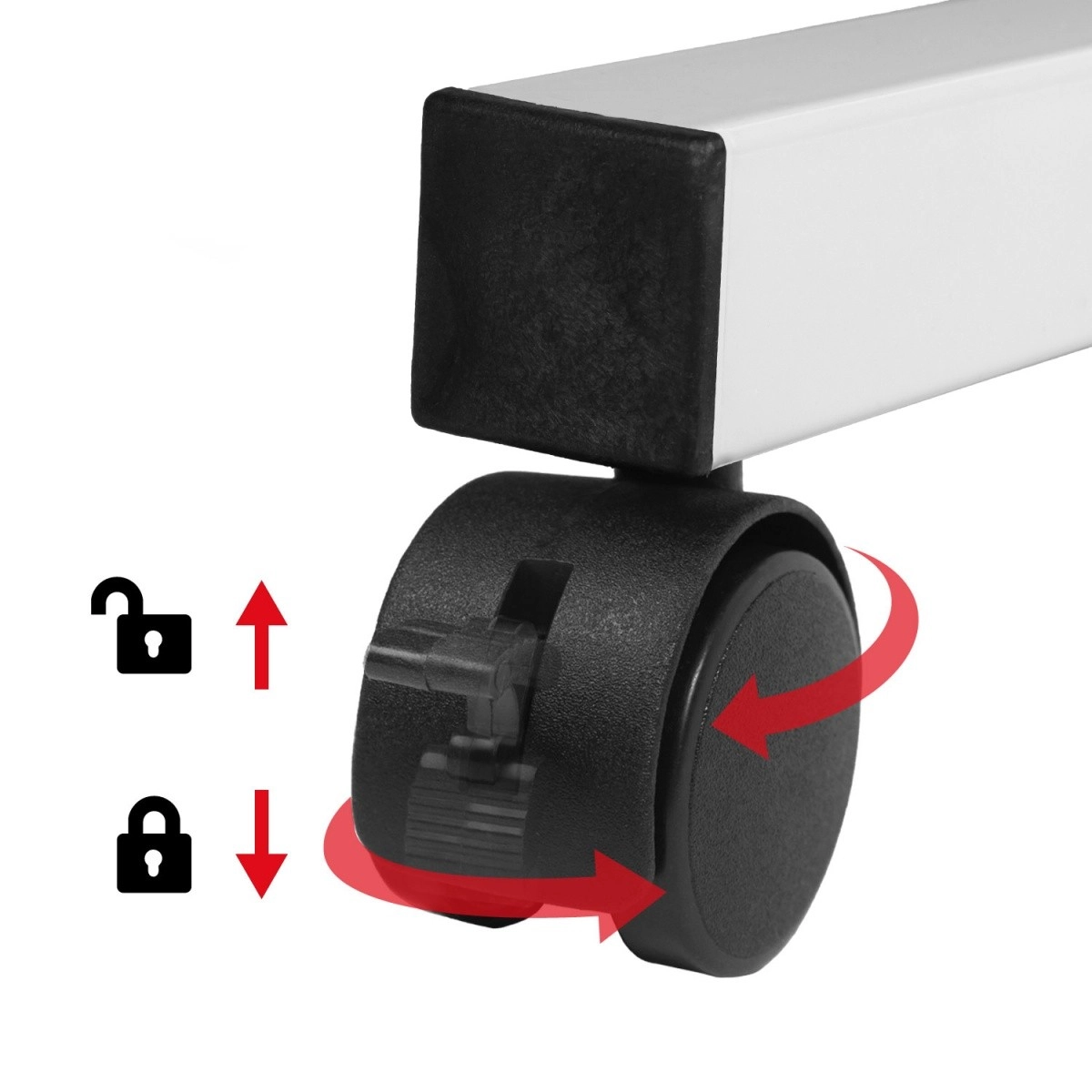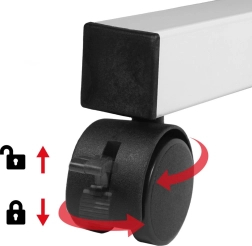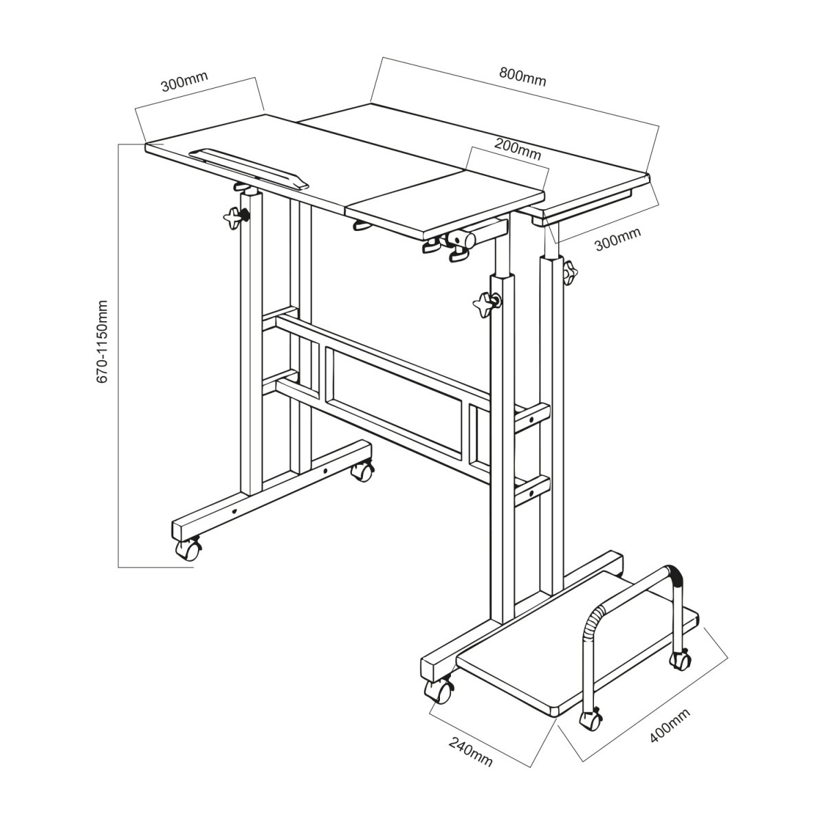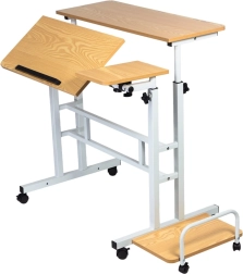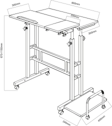 Del kompleta je tudi stranska polica 24 × 40 cm, idealna za namizni računalnik, tiskalnik ali druge naprave. Zaradi kolesc mizo zlahka premaknete tja, kjer jo trenutno potrebujete, in si tako tekoče prilagodite delovni kotiček. Višinsko nastavljanje v razponu pribl. 67–115 cm podpira bolj zdravo držo telesa sede in stoje.