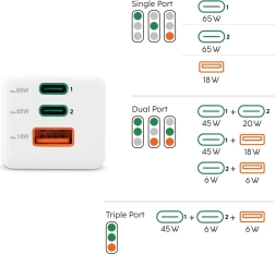 USB‑C1: 65 W; USB‑C2: 65 W; USB‑A: 18 W