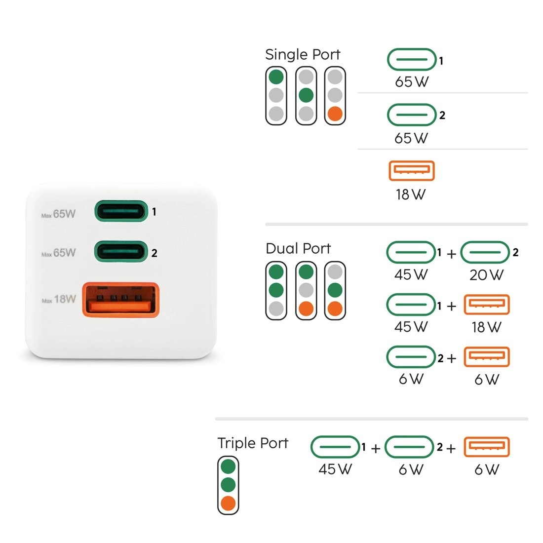 USB‑C1 + USB‑A: 45 W + 18 W