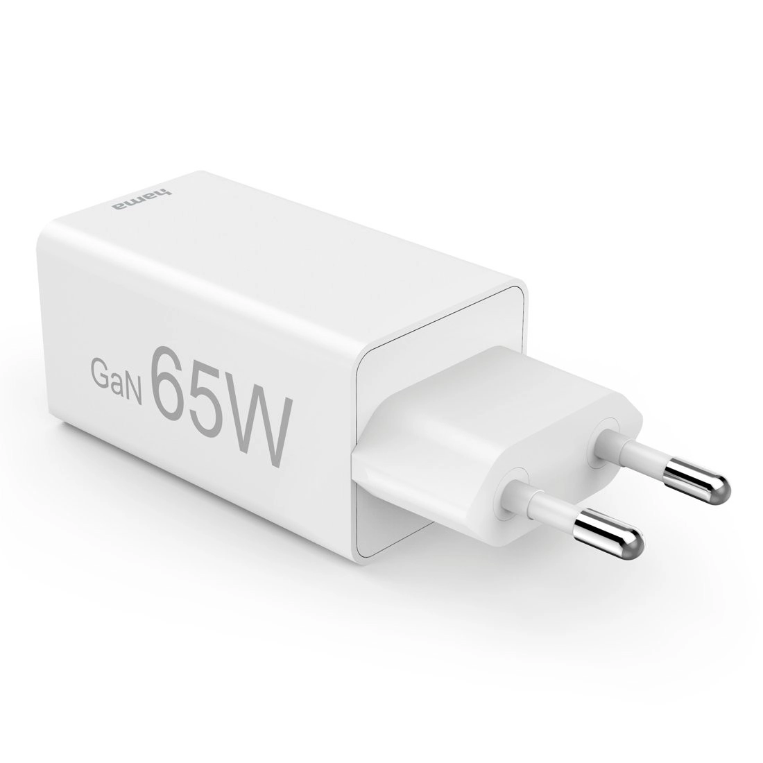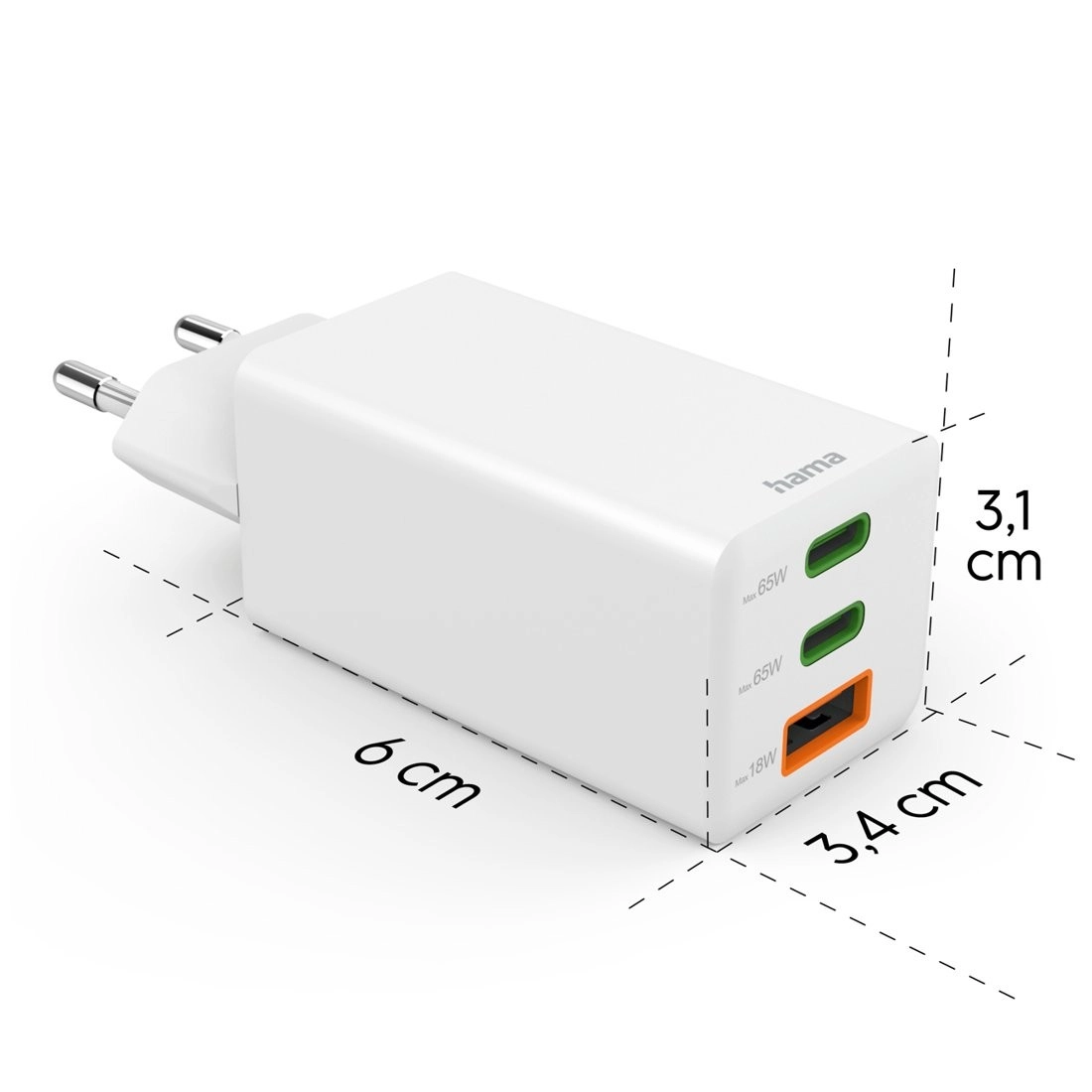 Kompakten omrežni polnilnik Hama s tehnologijo GaN in močjo 65 W hitro napolni telefon, tablico in prenosnik. Podpira Power Delivery in Quick Charge, ima 2× USB‑C + 1× USB‑A za sočasno polnjenje treh naprav. Ponuja varno polnjenje, pametno upravljanje toka in do 60 % v 30 minutah pri združljivih telefonih.