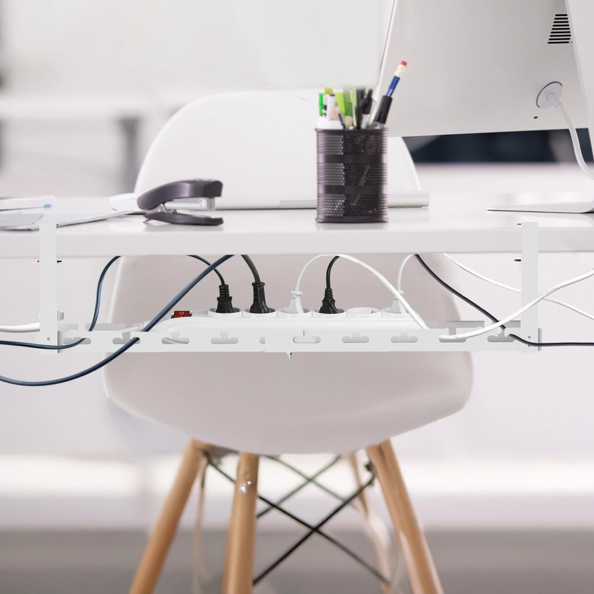 Praktičen organizator pod mizno ploščo pomaga ukrotiti kabelski kaos v pisarni, domači delovni sobi ali igralnem kotičku. Robustna kovinska konstrukcija s prehodnimi odprtinami in vzdolžnimi režami omogoča preprosto vodenje in povezovanje kablov, hkrati pa nudi dovolj prostora tudi za razdelilnik napajanja ali polnilnike.