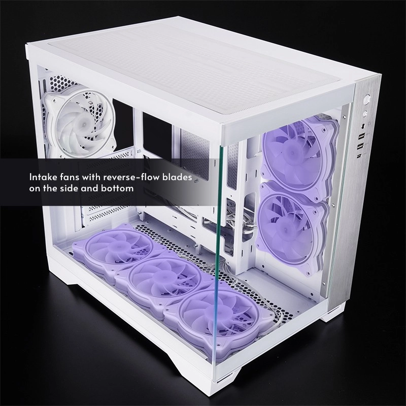 Sprednja in stranska plošča iz kaljenega stekla poudarita komponente in ARGB osvetlitev. Dvodeljna postavitev skrije kable in podpira pretok zraka.