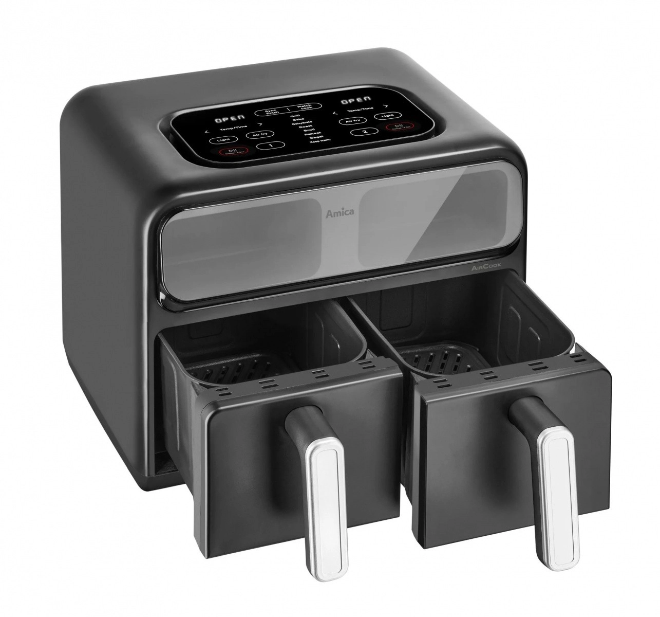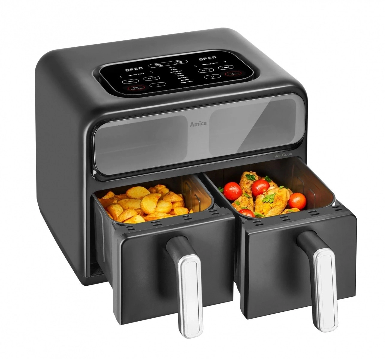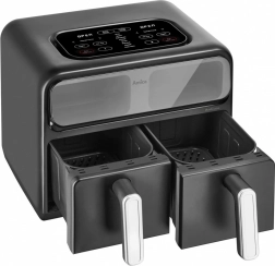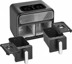 Specite hrustljav krompirček, sočno meso in krhko pecivo z minimalno količino olja zahvaljujoč dvopodročni cvrtnici na vroč zrak. Dva neodvisna predala omogočata hkratno pripravo različnih jedi, medtem ko praktično okence in zaslon na dotik z LED-prikazom zagotavljata popoln nadzor nad temperaturo in časom. Izkoristite bogato izbiro načinov, kot so AirFry, Bake, Roast in Dehydrate; funkciji Sinhronizacija in Dvojna kapaciteta prihranita čas, varnostne funkcije, kot sta samodejni izklop in zaščita pred pregrevanjem, pa poskrbijo za brezskrbno kuhanje.