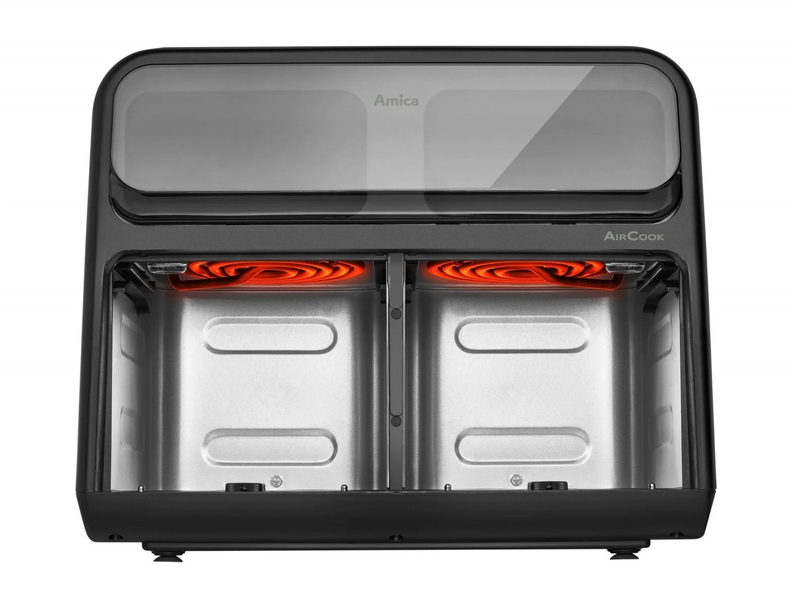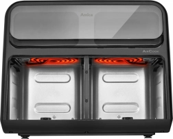 Odkrijte hitrejši in bolj zdrav način kuhanja. Dvokomorna cvrtnica na vroč zrak pripravi vaše najljubše jedi z minimalno maščobe zahvaljujoč intenzivnemu kroženju vročega zraka. Dve neodvisni coni omogočata sočasno peko in cvrtje različnih sestavin, z okenci pa imate potek priprave vedno pod nadzorom brez nepotrebnega odpiranja predalov.