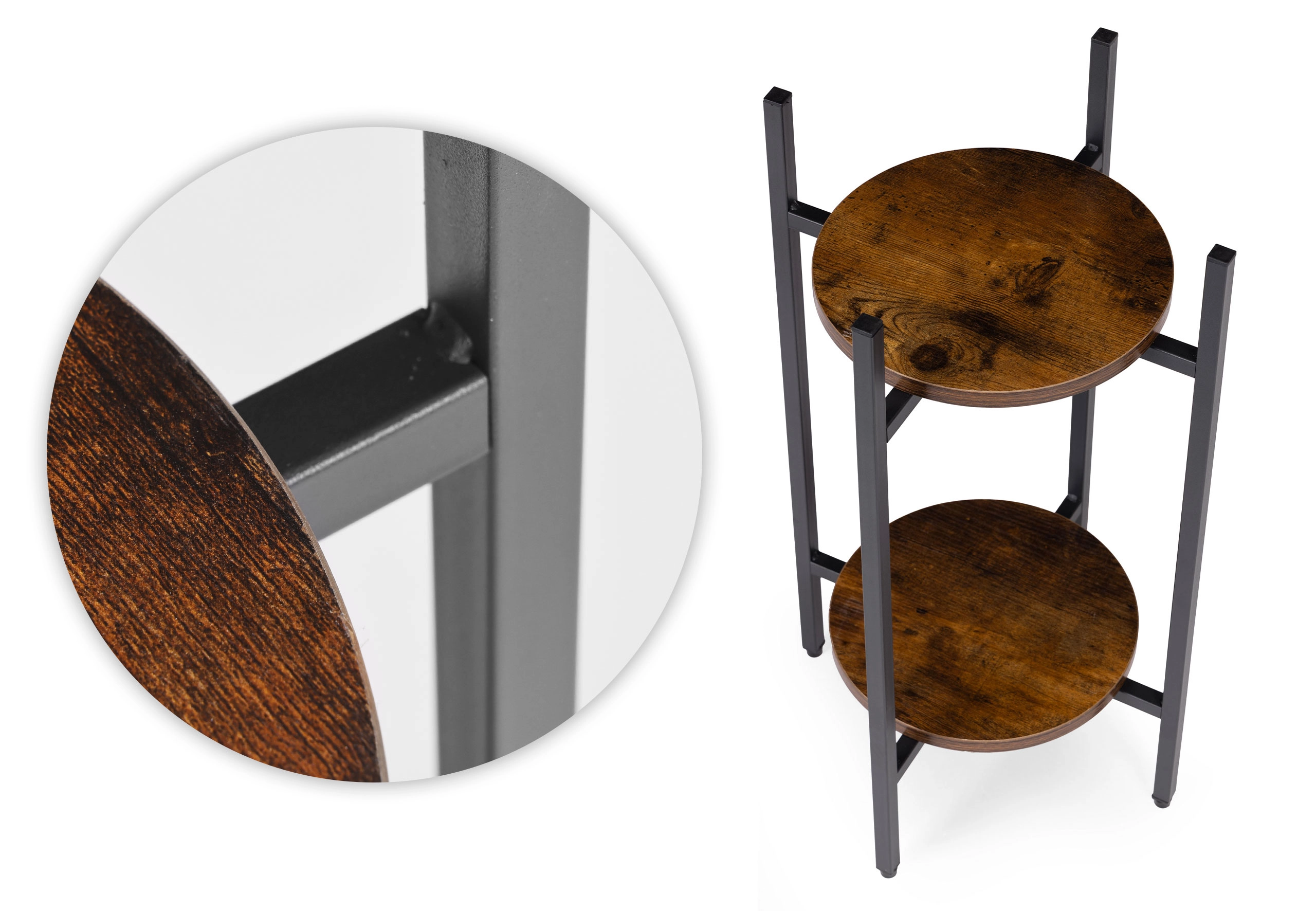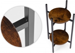 Konstrukcija iz prašno barvanega jekla je odporna proti koroziji in običajni obrabi, medtem ko police iz iverala v lesnem dekorju poudarijo loft karakter. Nedrseči zaključki ščitijo tla in zagotavljajo stabilnost. Z nosilnostjo do 5 kg je stojalo idealno za manjše do srednje velike lonce.