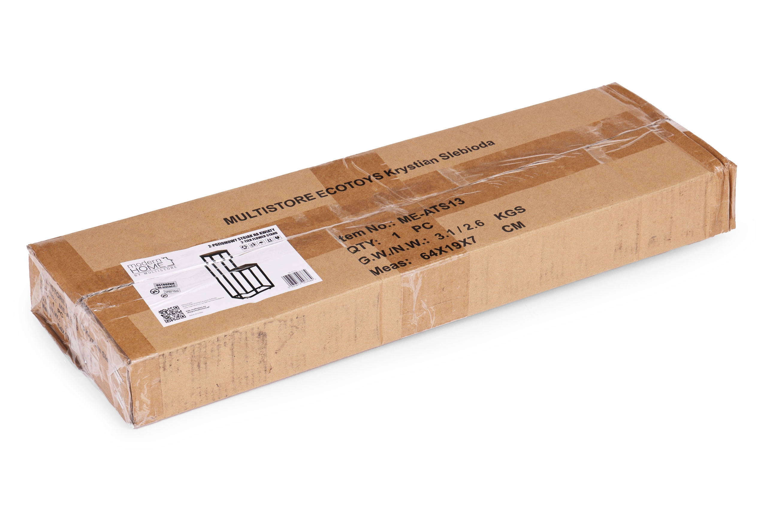 Okvir iz prašno lakiranega jekla zagotavlja stabilnost in dolgo življenjsko dobo, police iz ivernih plošč v dekorju lesa poudarijo industrijski značaj. Nedrseče blazinice ščitijo tla pred praskami in preprečujejo drsenje na gladkih površinah.
