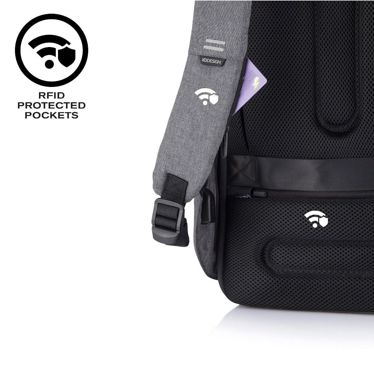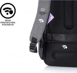 Glavni predal se odpira izključno s hrbtne strani, skrite zadrge in žepi z RFID zaščito pa na poti ali v mestnem prometu varujejo vaše dokumente, kartice in denarnico.