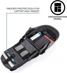 V notranjosti najdete pameten organizacijski panel s prožnimi mrežastimi žepi, oblazinjene predale za prenosnik do 13,3" in tablico do 12,9", ter praktičen USB priključek za polnjenje na poti. Ergonomske nastavljive naramnice, zračen hrbtni del in trak za pritrditev na teleskopski ročaj kovčka zagotavljajo udobje. Na naramnici je tudi držalo za očala, odsevni detajli pa izboljšajo vidnost.