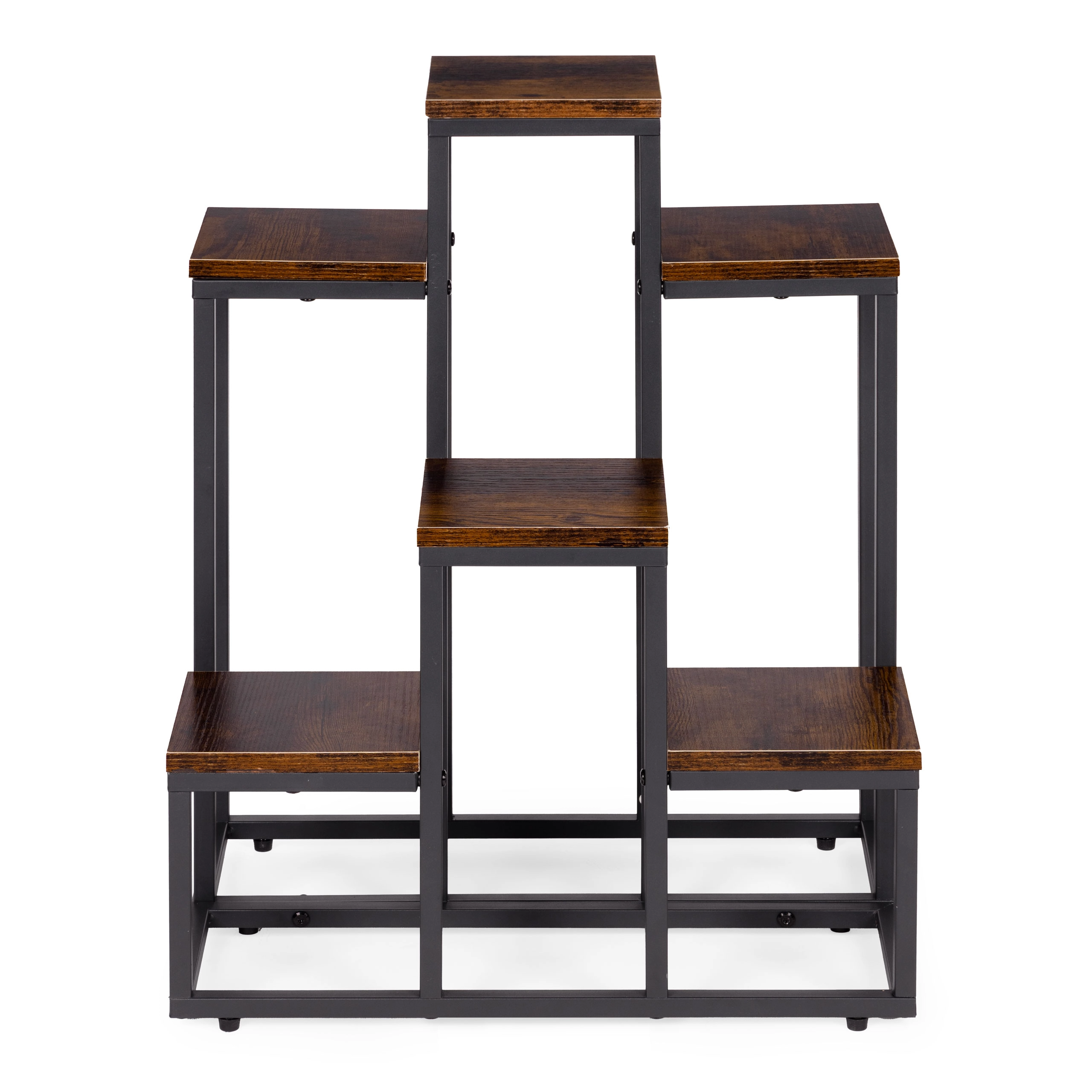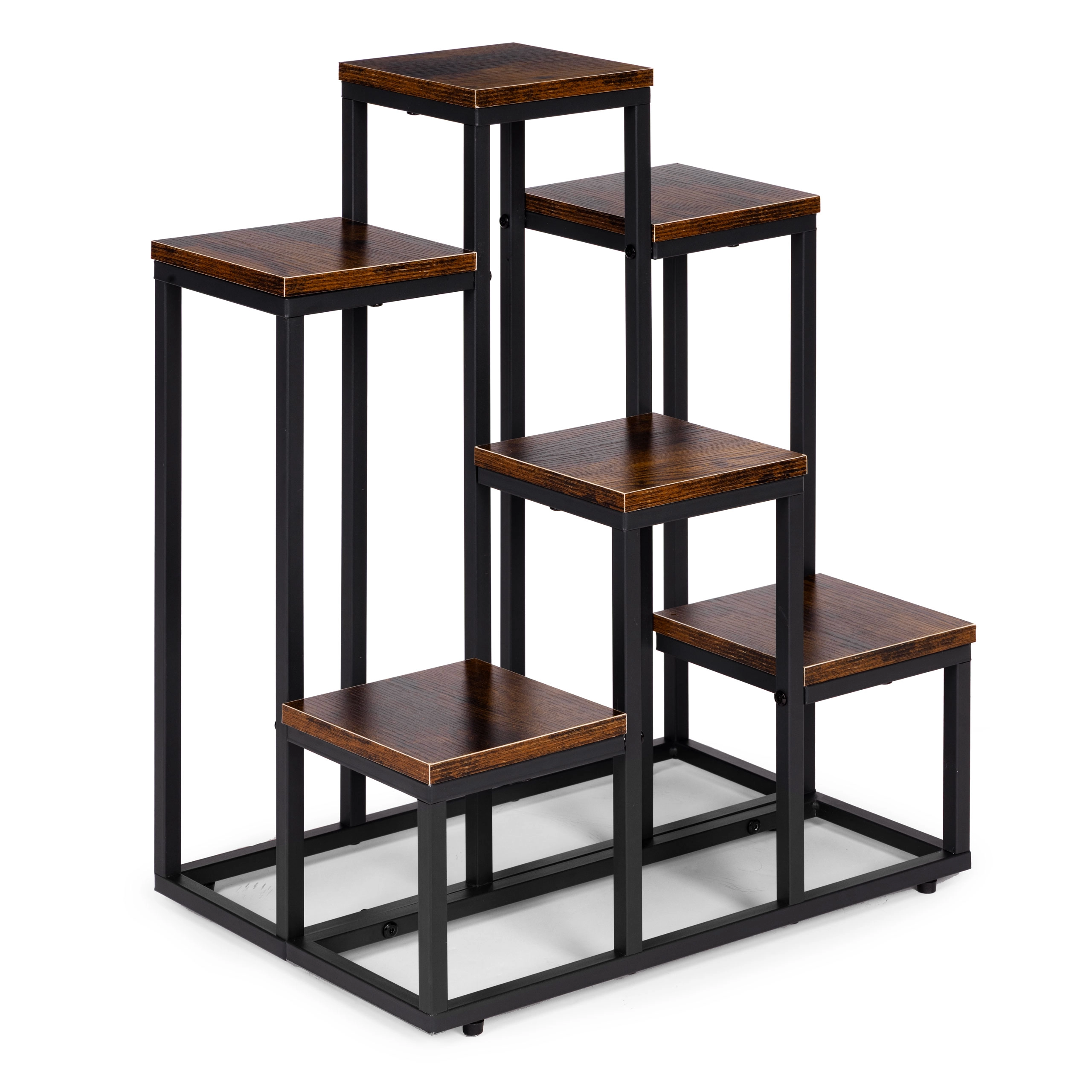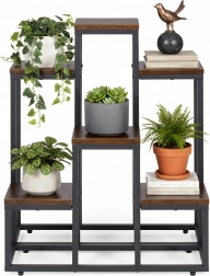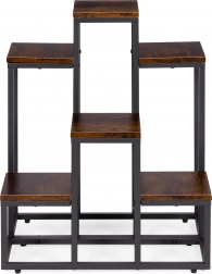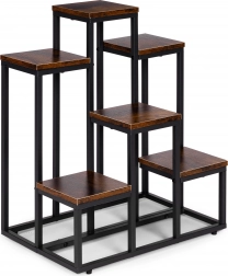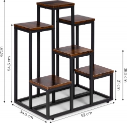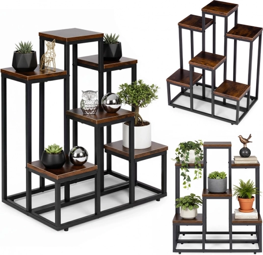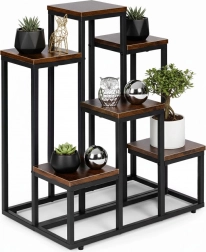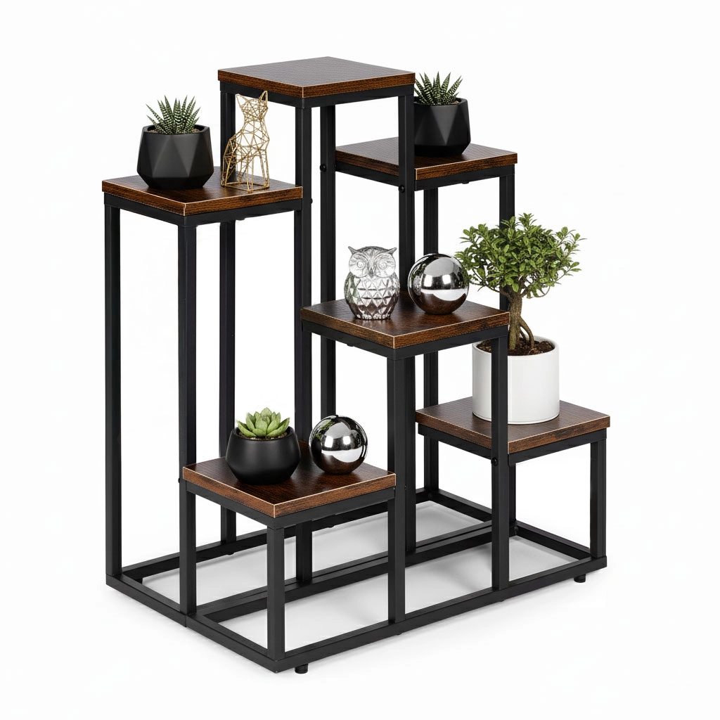 To večnivojsko stojalo za rože združuje moderen industrijski dizajn s praktičnostjo. Šest kvadratnih polic v lesnem dekorju ustvarja privlačno kompozicijo za zelišča, sukulente in viseče rastline, medtem ko črn jeklen okvir zagotavlja stabilnost in dolgo življenjsko dobo. Zahvaljujoč kompaktnih meram zlahka izkoristite vertikalni prostor ob steni ali v kotu prostora.