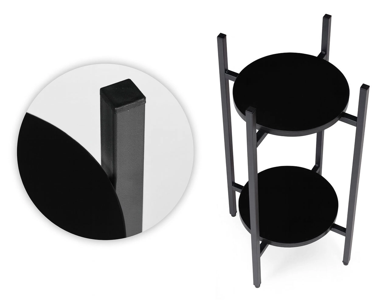 Konstrukcija iz praškasto lakiranega jekla zagotavlja dolgo življenjsko dobo in stabilnost, nedrseče nogice pa ščitijo tla. Zaradi kompaktnih mer se stojalo prilega tudi manjšim prostorom in lahko služi tudi kot majhna odlagalna mizica za sveče, knjige ali dekoracije.