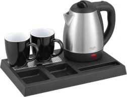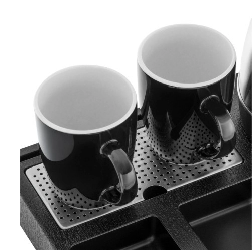Premišljene podrobnosti, kot so predalčki za čajne vrečke, kavo, sladkor ali smetanko, kapna rešetka za čistočo in integrirano napajanje grelnika, prihranijo prostor in čas osebju. Praktičen prostor za žličko/mešalnik dodatno ohranja vse na dosegu roke – idealna rešitev za moderne hotelske sobe.