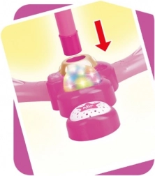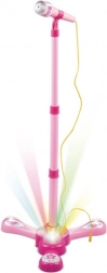 Pripravite doma nepozaben karaoke nastop. Ta roza mikrofon s stabilnim tripod stojalom ima privlačne svetlobne učinke in predvaja 12 vnaprej posnetih pesmi. Enostavno priključite MP3 predvajalnik ali mobilni telefon in predvajajte najljubše hite.