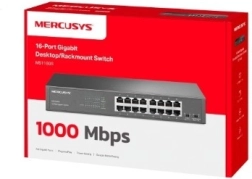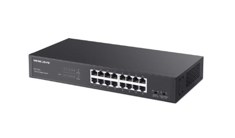 Zanesljivo in hitro omrežno stikalo za podjetja in domača omrežja: Mercusys MS116GS ponuja 16 gigabitnih RJ45 vrat, namestitev plug and play, način izolacije za višjo varnost ter zaščito pred zankami v trpežnem kovinskem ohišju.