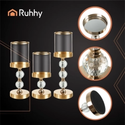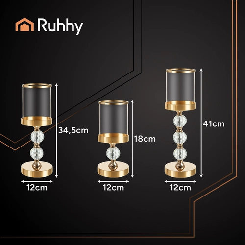 Ustvarite doma prijetno vzdušje z dizajnerskim setom svečnikov RUHHY. Tri različne višine delujejo harmonično in prostoru dodajo globino. Zrcalni elementi in kristalni poudarki poudarijo eleganten glamur stil, zlata izvedba pa interierju doda prefinjen lesk. Set je vsestranski – odlično se poda v dnevno sobo, spalnico, jedilnico in kopalnico.