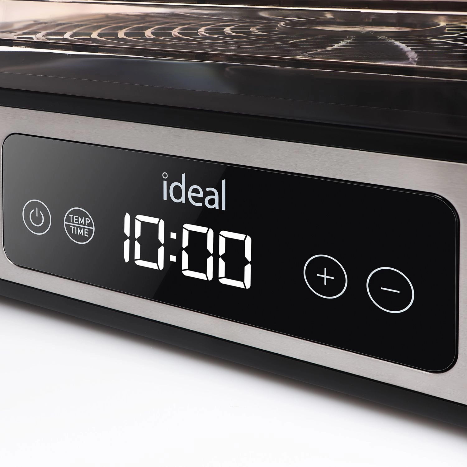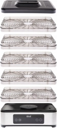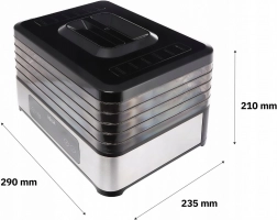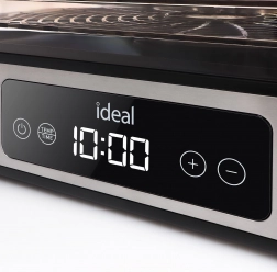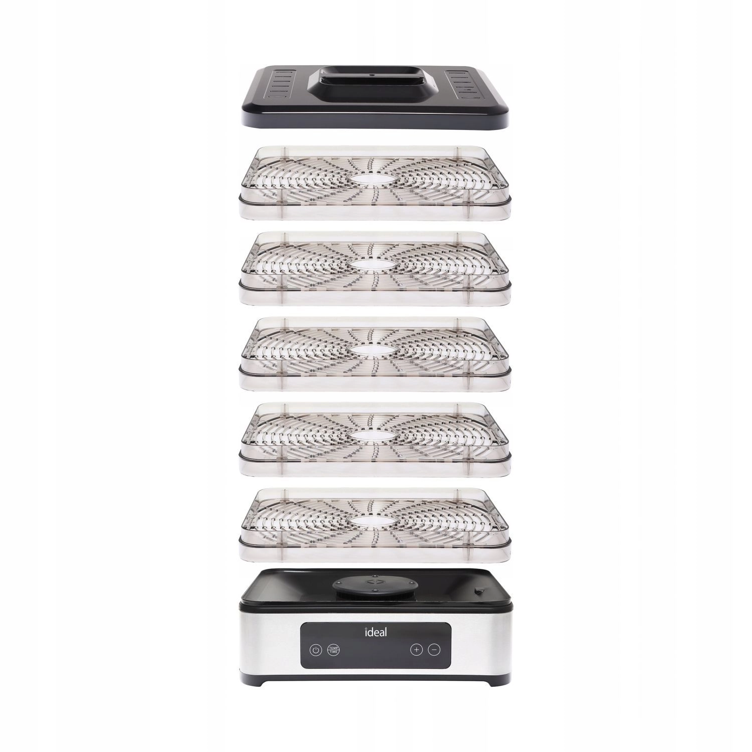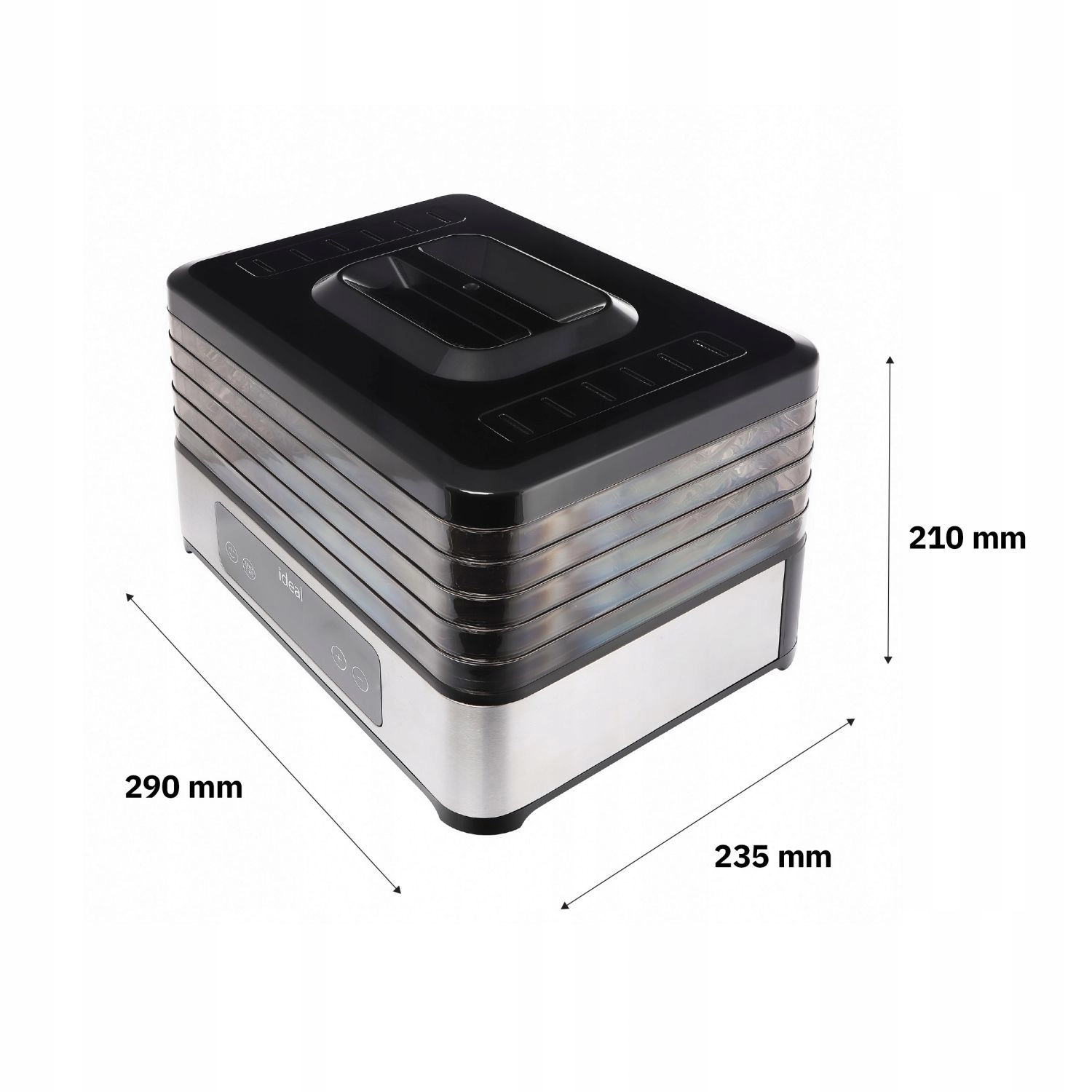 Upravljanje je zelo preprosto z elektronsko LED panelom in časovnikom od 30 minut do 24 ur. Tiho in energijsko varčno delovanje je primerno za nočno sušenje, prozorna zasnova pa omogoča sprotno spremljanje poteka brez odpiranja. Pladnji imajo nastavljivo višino za različne velikosti rezin, napravo pa je enostavno razstaviti in očistiti.